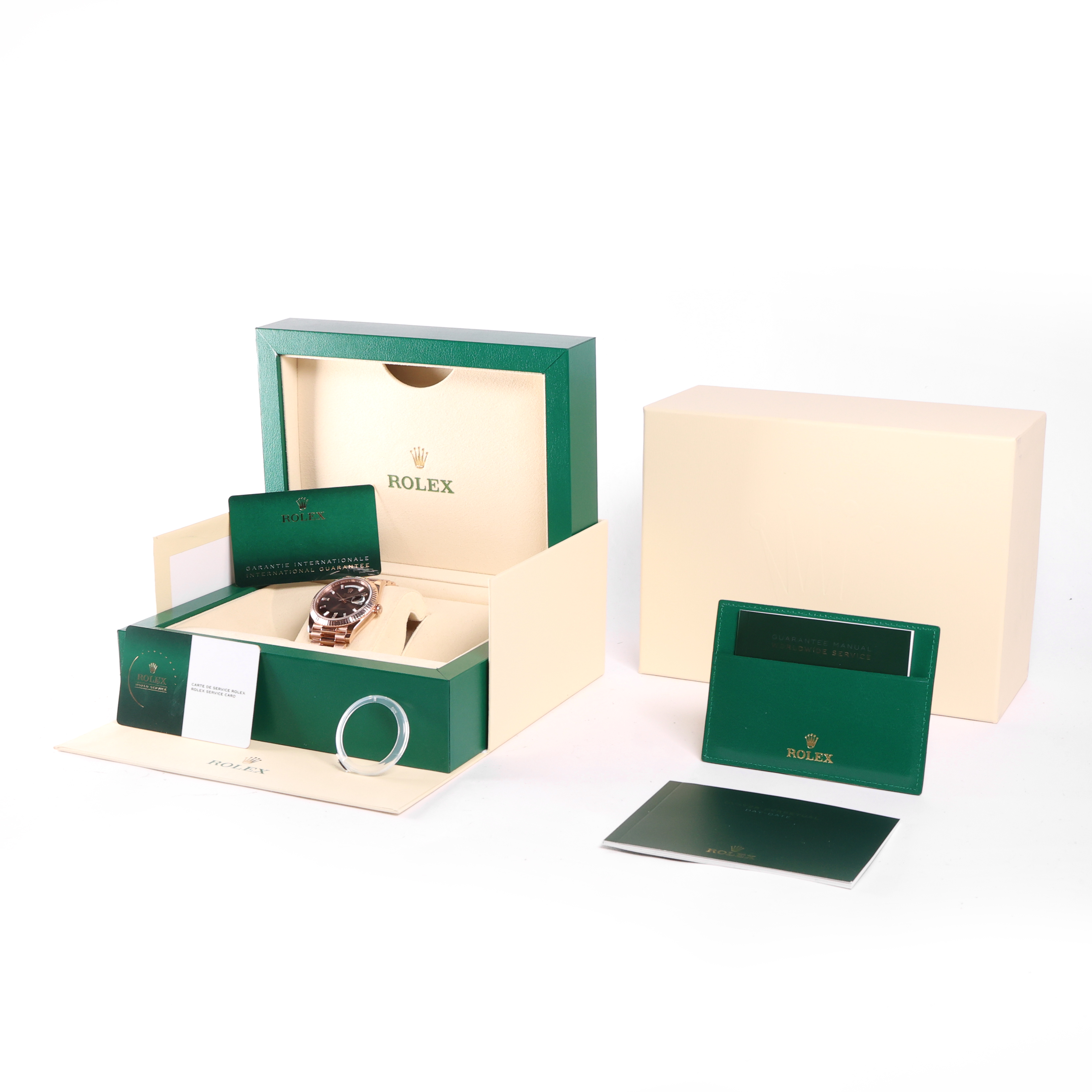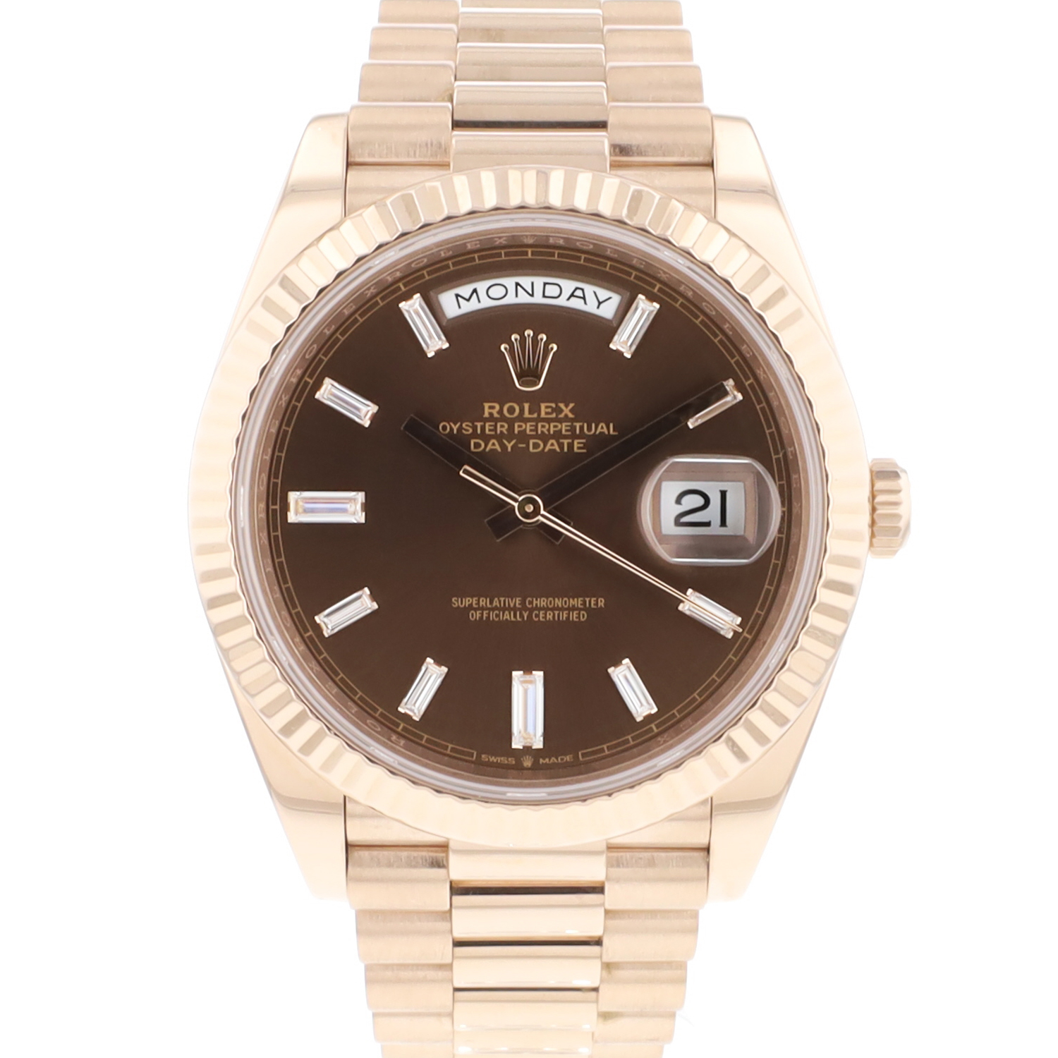 Wir informieren Sie gerne über die Rolex Day-Date 40mm Everose Gold Chocolate Baguette Diamond Dial Service '25